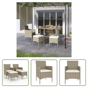 Po opadach deszczu lub śniegu należy wytrzeć i wysuszyć nadmiar wody lub śniegu z płaskiej powierzchni. Zapewnić odpowiednią cyrkulację powietrza, aby zapobiec uszkodzeniom związanym z wilgocią. KorzyściDodaj nowoczesny akcent do swojej przestrzeni zewnętrznej dzięki temu 4-częściowemu zestawowi krzeseł ogrodowych i stołków, idealnemu do każdego miejsca na zewnątrz, czy to przy basenie, na patio czy na balkonie. Pozostałe specyfikacjeKolor rattanu PE: beżowyKolor poduszek: