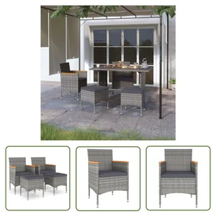 Po opadach deszczu lub śniegu należy wytrzeć i wysuszyć nadmiar wody lub śniegu z płaskiej powierzchni. Zapewnić odpowiednią cyrkulację powietrza, aby zapobiec uszkodzeniom związanym z wilgocią. KorzyściDodaj nowoczesny akcent do swojej przestrzeni zewnętrznej dzięki temu 4-częściowemu zestawowi krzeseł ogrodowych i stołków, idealnemu do każdego miejsca na zewnątrz, czy to przy basenie, na patio czy na balkonie. Pozostałe specyfikacjeKolor rattanu PE: szaryKolor tapicerki: