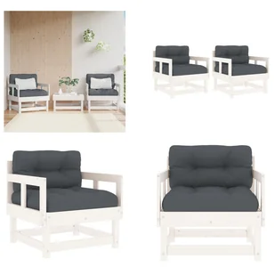 Krzesła ogrodowe z poduszkami 2 szt. Białe, lite drewno sosnoweTe drewniane krzesła ogrodowe, charakteryzujące się listwową konstrukcją i miękkimi poduszkami, są doskonałym dodatkiem do ogrodu, patio lub tarasu, aby spędzać przytulne godziny z rodziną lub przyjaciółmi. Lite drewno sosnowe: Lite drewno sosnowe to piękny, naturalny materiał. Drewno sosnowe ma proste słoje, a sęki nadają mu charakterystyczny, rustykalny wygląd.