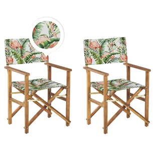 Drewniane krzesła reżyserskie z wymiennymi pokrowcami z tkaniny z motywem flaminga. Niezależnie od tego, czy zostaną umieszczone w salonie, czy w ogrodzie - ten zestaw z pewnością nada Twojemu domowi hollywoodzkiego charakteru. Rama wykonana jest z wytrzymałego i solidnego drewna akacjowego w naturalnym wykończeniu, które podkreśla ponadczasowy styl. Dostawa obejmuje dwa krzesła reżyserskie, każde ze standardowym pokryciem w kolorze szarym, a także 2 dodatkowe kolorowe alternatywne tkaniny ze wzorem flaminga. Daje to możliwość zmiany siedziska według własnego uznania i zapewnia różnorodność.