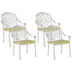 Szykowne krzesła wykonane z białego aluminium w praktycznym zestawie 4 sztuk. Połączenie elegancji, jakości i stylu vintage - te białe krzesła zachwycą każdego gościa swoją estetyką. Replika acyjne motywy i ozdobne kształty sprawiają, że krzesła są idealnym dodatkiem do wnętrz w stylu retro. Zestaw jest idealny do siedzenia podczas przerwy na kawę - czy to w ogrodzie, czy na balkonie. Szczegóły: Typ: Krzesło ogrodowe Styl: