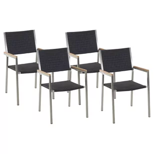 Nowoczesny zestaw 4 krzeseł ogrodowych wykonanych z czarnego rattanu z ramą ze stali nierdzewnej. Krzesła te wykonane są z odpornych na warunki pogodowe materiałów wysokiej jakości. Ich mocne i solidne ramy ze stali nierdzewnej mają wygodne podłokietniki wykonane z trwałego drewna syntetycznego. Siedziska i oparcia wykonane są z wytrzymałego splotu rattanowego, który również zapewnia przyjemne i wygodne siedzenie. Łatwy w pielęgnacji i wytrzymały materiał jest idealny do długotrwałego użytkowania na zewnątrz.