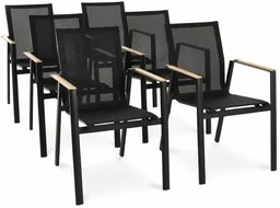 Zestaw 6 krzeseł ogrodowych Buti to nowoczesne, praktyczne i wygodne krzesła ogrodowe, które świetnie sprawdzą się jako wyposażenie każdej przestrzeni zewnętrznej ogrodu, tarasu czy balkonu. Połączenie aluminiowej ramy i tkaniny Textilene, z której wykonane zostało siedzisko i oparcie sprawia, że krzesło Buti jest lekkie i mobilne, a jednocześnie bardzo wytrzymałe, odporne na działanie warunków atmosferycznych . Minimalistyczny design krzesła w kolorze czarnym dopełniają beżowe podłokietniki z tworzywa polywood, które tworzą subtelny akcent kolorystyczny i materiałowy. To harmonijne połączenie nowoczesności i naturalnego akcentu sprawia, że krzesło zyskuje uniwersalny charakter, dzięki któremu z łatwością dopasujesz go do każdej aranżacji i do pozostałych mebli ogrodowych. Aluminiowa rama Konstrukcja krzesła Buti wykonana została z aluminium w głębokim czarnym kolorze i o matowym wykończeniu .