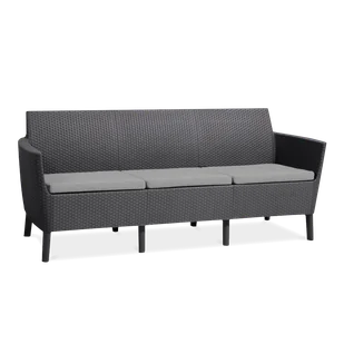 Salemo jest absolutnie nowy na rynku, który wyróżnia się zarówno stylem nowoczesnym, jak i retro. To elegancka trzyosobowa sofa z imitacji rattanu. Produkt jest wyposażony w wygodne poduszki w stylowych kolorach. Lekkie i stabilne wzornictwo mebli idealnie pasuje zarówno na zewnątrz, jak i do wnętrza. Jest bardzo łatwy w utrzymaniu. Produkt jest wysoce odporny na promienie UV i warunki atmosferyczne.
