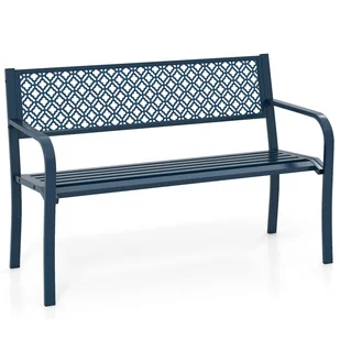 ------Dzięki solidnej metalowej konstrukcji ta ławka ogrodowa wytrzymuje obciążenie do 360 kg i gwarantuje długotrwałą wytrzymałość. Ponadto ten mebel ogrodowy łączy w sobie przestronną szerokość 127 cm z ergonomiczną konstrukcją, obejmującą pochylone oparcie, zakrzywione podłokietniki i profilowane siedzisko z listewkami, zapewniające niezrównany komfort, co czyni go idealnym wyborem do intymnych rozmów lub spotkań z bliskimi. Eleganckie geometryczne wzory kratki na oparciu nadają nowoczesny charakter różnym wnętrzom, dzięki czemu ta metalowa ławka jest wszechstronnym wyborem do ogrodu, tarasu lub werandy.