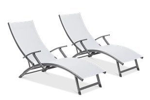 leżaka Cechy produktu zestaw 2 leżaków ogrodowych z regulowanym oparciem (4 pozycje) lekka i stabilna konstrukcja wykonana z aluminium w kolorze ciemnoszarym, malowana metodą proszkową pokrycie z tkaniny Textiline, wyplot 2x1 w kolorze szarym wysoka odporność na niekorzystne czynniki pogodowe i promieniowanie UV ergonomiczny profil – gwarancja komfortowego wypoczynku łatwy do utrzymania w czystości – do pielęgnacji wystarczy tylko wilgotna ściereczka maksymalne obciążenie: 120 kg leżak w stanie zmontowanym Wymiary Długość - 175 cm Szerokość - 57,5 cm Wysokość - 35 cm Wysokość (podniesione oparcie) - 88 cm