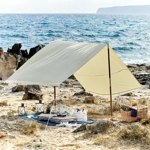 Pokrycie z pięknego i wytrzymałego płótna bawełnianego chroni nawet przed krótkim deszczem. Pręty namiotu wykonane zostały z żelaza połączonego z solidnym drewnem tekowym o bielonym wykończeniu. Idealny na lato!