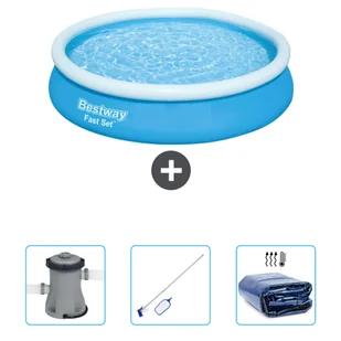 Ten zestaw czyszczący jest odpowiedni do wszystkich basenów o średnicy do 396cm. Zestaw jest wyposażony w lekki teleskopowy uchwyt o maksymalnej długości 167 cm. W zestawie żagiel przeciwsłoneczny WAYS D'luxeChroń wodę w swoim basenie dzięki pokrywie solarnej WAYS D'luxe. Ta wysokiej jakości pokrywa utrzymuje basen w czystości i zapobiega wnikaniu brudu i liści. Ciemny kolor żagla zapewnia również, że woda pozostaje cieplejsza przez dłuższy czas w porównaniu z konwencjonalnymi niebieskimi żaglami słonecznymi Dzięki grubości 200 mikrometrów pokrywa solarna zapewnia doskonałą izolację, aczarna podstawa zapewnia mniejszy wzrost glonów w wodzie Zawartość opakowaniaZestaw Bestway Fast Set - 366 x 76 cm (1x)Pompa filtrująca Bestway 1249 litrów na godzinęZestaw czyszczący BestwayOkrągły żagiel słoneczny WAYS D'luxe - 366 cm Dane techniczne basenuGłębokość basenu: