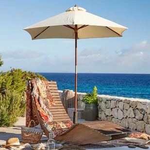 Nadaje się również na mniejszy balkon lub intymne zacienione miejsce w ogrodzie. Najwyższa jakość jest oczywiście warunkiem długiej żywotności, nawet w przypadku bardziej kompaktowych osłon przeciwsłonecznych. Maszt, rozpórki i korona wykonane zostały z litego drewna eukaliptusowego. daszek ze zintegrowaną osłoną przeciwburzową powstał z wysokiej jakości olefiny/poliestru i może wytrzymać sporadyczny deszcz. Pasujący stojak na parasol można znaleźć osobno w naszym sklepie.