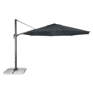 Parasol zawiera również stojak (bez płyt 50 x 50 x 4/8 cm). Parasol można obracać o 360° i przechylać wzdłuż głównego drążka, co pozwala na zacienienie przez cały dzień w zależności od potrzeb.