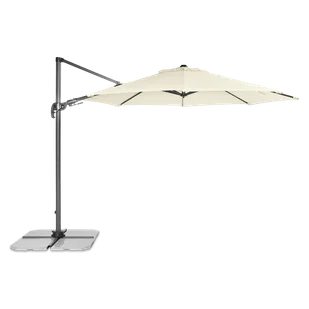 Parasol firmy Doppler/Derby Ravenna AX 330 cm (Film z parasolem Ravenna AX 275x275 - wszystkie funkcje działają tak samo) Ravenna AX 330 cm Wielofunkcyjny parasol z bocznym masztem Ravenna AX 300 cm ma łatwy w obsłudze mechanizm korbowy. Czasza parasola wykonana jest z tkaniny poliestrowej odpornej na deszcz i ma dobry współczynnik ochrony przeciwsłonecznej 50+. Parasol można obracać 360 ° wokół masztu a czaszę pochylać na boki. Dostarczany w raz z metalową podstawą obciążaną 4 płytami 50x50 cm (bez płyt). OGÓLNIE • Rozmiar parasola ok.