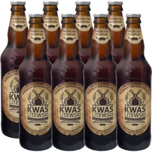 Kwas chlebowy litewski Zestaw 8x500ml Kwas chlebowy litewski jest napojem ekologicznym, naturalnym, bez konserwantów. Jest doskonałą i zdrową alternatywą dla słodzonych napojów gazowanych z dużą ilością barwników i konserwantów, które mają niekorzystne działanie dla naszego zdrowia. Posiada cenne składniki odżywcze, takie jak mikroelementy, witaminy - szczególnie z grupy B (dzięki ekstraktowi słodu), C, E oraz aminokwasy. Kwas chlebowy litewski posiada przyjemny brązowy kolor, aromat chleba i charakterystyczny przyjemny smak harmonizujących ze sobą nut - słodkiej, gorzkiej i kwaśnej. Jest napojem bezalkoholowym.