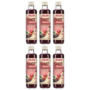 Shot na odporność polskie owoce zestaw 6 x 250 ml Jedno opakowanie to 5 porcji produktu – na 5 dni. Sugerujemy pić po 50 ml raz dziennie (do posiłku). Sok zawiera duże ilości osadu (to w nim jest bogactwo substancji odżywczych), przed piciem należy wstrząsać butelkę. Witamina C w produkcie pochodzi wyłącznie z wytłoczonych owoców róży, jest w pełni naturalna.