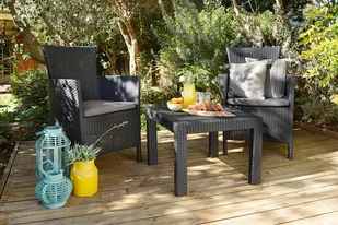 Zestaw mebli na balkon Curver Rosario SET to propozycja dla wszystkich, którzy dysponują mniejszymi i większymi przestrzeniami, które wymagają zagospodarowania. Zestaw Rosario składa się z dwóch foteli oraz stolika. Wszystkie elementy są wykonane z technorattanu - wytrzymałego i odpornego materiału. Wyglądem przypomina on naturalny rattan, ale jest zdecydowanie bardziej odporny na działanie warunków atmosferycznych i promieni UV.
