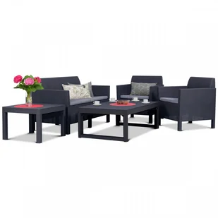 Zestaw Mebli ogrodowych Orlando set Lyon to stylowy, czteroosobowy komplet z tworzywa sztucznego o rattanowej strukturze. Składa się z dwuosobowej sofy, dwóch foteli, kwadratowego stolika kawowego oraz bestsellerowego ławostołu Lyon.