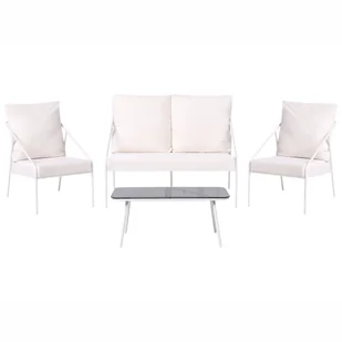 Stalowy komplet ogrodowy z poduchami. Stwórz idealne miejsce do wypoczynku na świeżym powietrzu z tym nowoczesnym zestawem ogrodowym, który składa się z 2-osobowej sofy, 2 foteli i eleganckiego stolika kawowego. Komplet opiera się na solidnej stalowej ramie, uzupełnionej o wygodne poduchy ze zdejmowanymi powłoczkami. Hartowany szklany blat stolika jest z kolei łatwy w utrzymaniu w czystości na co dzień. Dzięki odporności na promieniowanie UV, wodę i plamy, ten zestaw jest stworzony aby wytrzymać różne warunki pogodowe.