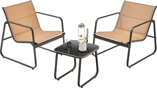 Ponadto kompaktowy, ale funkcjonalny stolik kawowy ułatwia przenoszenie napojów lub przekąsek. Blat z hartowanego szkła jest dość łatwy w utrzymaniu. Ten 3-częściowy zestaw mebli ogrodowych będzie pięknym dodatkiem do podwórka, basenu itp. Cechy: Wygodne siedzisko z ergonomicznymi podłokietnikami i oparciemSolidna metalowa rama zapewniająca wysoką stabilnośćOddychająca i wysokiej jakości tkanina siedziska chroni przed gorącemStolik kawowy ułatwia jedzenie i picieBlat z hartowanego szkła ułatwia konserwacjęRegulowane podnóżki zwiększają stabilnośćIdealny na podwórko, basen, balkon itp. Krzyżak krzesła z blokadą śrubową ułatwia montażDane techniczne: