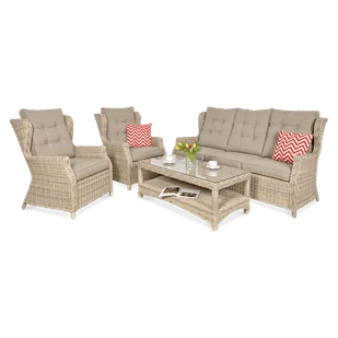 Cechy produktu zestaw przeznaczony jest do użytku zewnętrznego i wewnętrznego w skład kompletu wchodzi funkcjonalna 3-osobowa sofa, 2 duże i wygodne fotele, stolik i poduchy stelaż wykonany jest z aluminium malowanego proszkowo, co zapewnia stabilność i lekkość konstrukcji oraz całkowitą odporność na rdzę do wykończenia użyty został najwyższej jakości technorattan w odcieniu beżowym o dodatkowy komfort dbają grube i wygodne poduszki z zamkiem błyskawicznym stolik wyposażony jest w bezpieczną szybę z hartowanego szkła o grubości 5mm całość jest bardzo łatwa do utrzymania w czystości, do pielęgnacji wystarczy tylko wilgotna ściereczka dzięki użyciu materiałów wysokiej jakości (technorattan, aluminium), nasz zestaw oznacza się maksymalną trwałością, odpornością na warunki atmosferyczne i promieniowanie UV rewelacyjny do ogrodu, na taras oraz do wszystkich wnętrz mieszkalnychWymiary stolik: długość - 120 cm, szerokość - 60 cm, wysokość - 45 cm fotel: szerokość - 73 cm, głębokość - 85 cm, wysokość - 100 cm sofa: szerokość - 187 cm, głębokość - 85 cm, wysokość - 100 cm