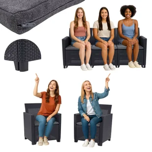 KETER MARIE – Zestaw mebli ogrodowych Sofa i Fotele Grafitowe z poduszkami – 2 konfiguracje, system CLICK IT