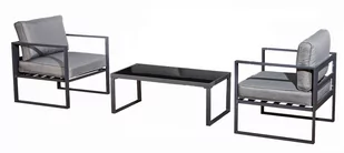 Kolor zestawu MOSTRARE: ciemno szary Kolor poduszek: szary melanż Konstrukcja mebli: aluminiowa (wymaga nieskomplikowanego skręcenia) Zestaw złożony z 3 elementów: 2 x fotel :