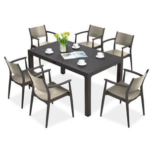 Meble jadalniane Novussi SEGINUS 6+1 Brown/Desert Brown - Komplet mebli Seginus 6 w kolorze brązowym (brown/desert brown) to idealny wybór dla wymagających. Przeznaczony do profesjonalnego użytku i odznaczony certyfikatem CATAS może być bezpiecznie stosowany w przestrzeniach publicznych. Stworzono go przede wszystkim z myślą o branży HoReCa, ale sprawdzi się świetnie również w Twoim ogrodzie lub na tarasie. Pomoże Ci stworzyć idealny kącik do spożywania posiłków na świeżym powietrzu i wykorzystać do maksimum pogodne dni. Zestaw Seginus 6 wykonano z polipropylenu wzmocnionego włóknem szklanym.