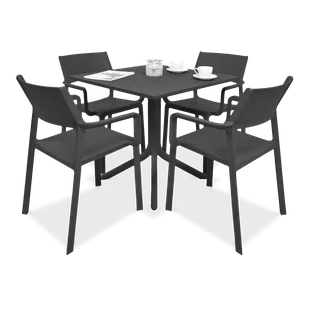 Meble Nardi TRILL/CLIP 4+1 Antracite - Meble ogrodowe TRILL/CLIP 4+1 Antracite to nowoczesny komplet jadalniany, którego autorem jest znany i ceniony producent mebli ogrodowych premium - marka Nardi. Te meble do restauracji i ogrodu zaprojektowane zostały zarówno z myślą o najbardziej wymagającym kliencie segmentu HoReCa (hotele, kawiarnie, ogródki gastronomiczne) jak i również kliencie detalicznym, który oczekuje po prostu najwyższej jakości. Mamy tu więc najlepsze materiały w postaci 100% polipropylenu wzmacnianego włóknem szklanym, modne kolory, nowoczesny i jednocześnie uniwersalny design oraz wytrzymałość na najwyższym możliwym poziomie. Przewaga mebli ogrodowych z tworzywa nad innymi jest m. in. taka, że nie wymagają żadnych zabiegów konserwacyjnych, są odporne na śnieg, mróz, deszcz i słońce, generalnie mogą stać na dworze przez cały okrągły rok.