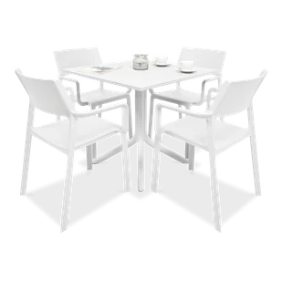 Meble Nardi TRILL/CLIP 4+1 Bianco zapewnią miejsce czterem dorosłym osobom, które mogą zjeść posiłek lub wypić kawę przy funkcjonalnym stole jadalnianym w komfortowych warunkach. Gorąco polecamy do przydomowego ogrodu i dla wszystkich właścicieli ogródków gastronomicznych i restauracji. Cechy produktu meble ogrodowe TRILL/CLIP 4+1 Bianco zaprojektowała włoska marka Nardi, która produkuje najlepsze meble z tworzywa w Europie cały zestaw wykonany jest z żywicy polipropylenowej, którą dodatkowo wzmocniono włóknem szklanym dla osiągnięcia maksimum trwałości zastosowane tworzywo ma na całym swoim przekroju jednolitą strukturę i kolor, nie traci więc barwy pomimo intensywnego użytkowania meble do restauracji TRILL/CLIP 4+1 Bianco oferują w komplecie 4 wygodne krzesła i bardzo praktyczny stół jadalniany nogi zakończone są antypoślizgowym tworzywem, co zapewnia bezpieczeństwo na mokrym tarasie, dodatkowo nogi stołu można poziomować w przypadku nierównego podłoża krzesła można nakładać jedno na drugie (sztaplować), co ma znaczenie wszędzie tam gdzie ważna jest oszczędność miejsca i mobilność stół jadalniany, dzięki specjalnemu projektowi nóg zapewnia jednocześnie stabilność i dużą swobodę ruchów dla osób siedzących zestaw ogrodowy został zaprojektowany pod kątem intensywnego użytkowania i wyróżnia się najwyższym współczynnikiem odporności na niepogodę i promieniowanie UV meble są bardzo łatwe do utrzymania w czystości, wystarczy zmyć je wodą z węża ogrodowego lub użyć wilgotnej ściereczki najwyższą jakości mebli ogrodowych Nardi potwierdza przyznany im przez instytut badawczy CATAS specjalny certyfikat który informuję, że przeprowadzone testy wytrzymałościowe rekomendują meble do użytkowania w dużych obiektach publicznych takich jak hotele, restauracje, aquaparki i inne ośrodki wypoczynkoweWymiary krzesło: szerokość - 58,5 cm, głębokość - 53,5 cm, wysokość - 82,5 cm stolik: długość - 80 cm, szerokość - 80 cm, wysokość - 75 cm