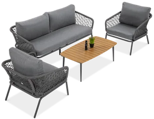 Idealne rozwiązanie dla osób, które cenią sobie wysoką jakość, estetykę i wygodę. Zapewnij sobie wyjątkowe doświadczenie na świeżym powietrzu z tym prestiżowym zestawem mebli od marki Furrore. Cechy produktu Konstrukcja wykonana z odpornego na korozję aluminium opleciona sznurem Blat stolika wykonany z materiału polywood Blat stołu ma grubość 15mm Grubość poduszek siedziska to 10cm a oparcia 18 cm Wysokość siedziska sofy i foteli to 32cm Materiał z jakiego wykonane są poszewki poduszek to poliester przędzony i olefin Poduszki są wypełnione pianką i włóknem Poszewki poduszek wyposażone są w zamki błyskawiczne, co znacznie ułatwi utrzymanie ich w czystościWymiary Sofa: szerokość - 173,5 cm, głębokość - 80 cm, wysokość - 70 cm Fotel: szerokość - 76,5 cm, głębokość- 80 cm, wysokość - 70 cm Stolik: