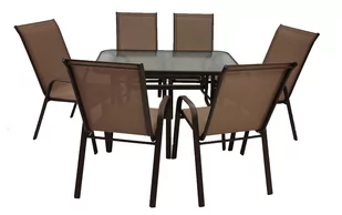 Blat stołu wykonany z wytrzymałego szkła hartowanego na wzór falującej wody Profile stalowe malowane proszkowo Nadaje się do użytku na zewnątrz i wewnątrz Łatwy montaż Rozmiar blatu: 120x70 cm Wysokość: 70 cm pecyfikacja krzesła Majorka: Szerokość: 55,5 cm Głębokość: 65 cm Wysokość: