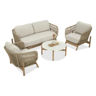 To naturalny proces, który podkreśla jego niepowtarzalność. Pamiętaj! Meble należy chronić przed bezpośrednią ekspozycją na opady atmosferyczne z uwagi na dbałość o ich drewniane elementy, które są materiałem naturalnym. Aby zestaw jak najdłużej cieszył swoim nieskazitelnym wyglądem, zalecamy stosowanie odpowiedniej pielęgnacji takiej jak impregnowanie, zabezpieczenie pokrowcem, a w okresie zimowym przechowywanie w suchym miejscu. Cechy produktuWygodne miejsce do relaksu na świeżym powietrzu Ekskluzywny design i wysoka jakość wykonania Funkcjonalny zestaw, który zawiera sofy, fotele i stolik kawowyKomfortowe siedziska i grube poduszki z lnianej tkaniny Drewno akacjowe odporne na warunki atmosferyczne Liny w naturalnym kolorze dodające egzotycznego klimatuEstetyczny wygląd podkreśla elegancję tarasuOdporność na promieniowanie UV zapewnia długotrwałą trwałość. Łatwość utrzymania w czystości ułatwia pielęgnację mebliHarmonijne współgranie z otoczeniem dzięki stonowanej kolorystyce.