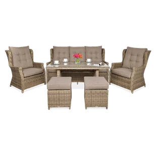 Komfort użytkowania to priorytet zestawu Trivento Dining 3 z pufami w odcieniu brązowym. Wyściełane miękkimi i odpornymi na odkształcenia poduszkami siedziska i oparcia zapewniają doskonałe wsparcie podczas relaksu na świeżym powietrzu. Klasyczny styl mebli doskonale harmonizuje z różnorodnymi aranżacjami ogrodowymi, zwłaszcza w stylu angielskim. Nasza propozycja nie tylko pełni funkcję wypoczynkową, ale także doskonale sprawdzi się jako przestrzeń jadalniana. Zestaw Trivento Dining 3 Brwon z pufami doskonale sprawdzi się podczas śniadania, obiadu czy kolacji na świeżym powietrzu.