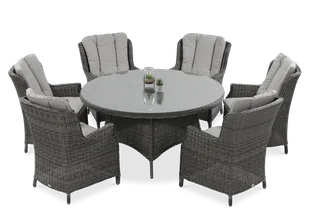 Meble z technorattanu RAVENA Dark Grey - Zestaw technorattanowy Ravena Dark Grey doskonale pokazuje, jak obecnie wyglądają ekskluzywne meble ogrodowe. Eleganckie i komfortowe, a zarazem niezwykle trwałe. Zestaw Ravena składa się z 7 części: sześciu foteli i dużego, okrągłego stołu. Wszystkie meble z technorattanu wyróżnia wygoda - i nie inaczej jest w tym przypadku.