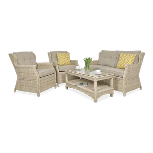Meble z technorattanu TRIVENTO 2 Beige - Czteroczęściowy zestaw mebli ogrodowych z technorattanu, przeznaczony zarówno do użytku zewnętrznego, jak i pasujący do domowych wnętrz. Na elegancki i praktyczny komplet Trivento składają się dwa duże, komfortowe fotele, dwuosobowa sofa oraz stolik z półeczką i blatem z hartowanego szkła. Półokrągła plecionka technorattanowa w meblach Trivento Beige prezentuje się identycznie jak w tradycyjnych wyrobach rzemieślniczych, lecz na wielu polach ma nad nimi wyraźną przewagę. Przede wszystkim w szeroko rozumianej wytrzymałości - meble technorattanowe Trivento są lekkie, elastyczne, banalnie łatwe w codziennej pielęgnacji, w zasadzie całkowicie odporne na kaprysy pogody. Kiedy inne meble ogrodowe blakną w słońcu i niszczeją na deszczu lub śniegu, zestaw Trivento Beige utrzymuje żywy, intensywny kolor oraz maksymalną użyteczność.