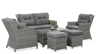 Zachęcamy do wprowadzenia stylu i komfortu do swojego ogrodu, tarasu czy wnętrza mieszkalnego za pomocą naszego rewelacyjnego zestawu mebli Trivento 2 Stone Grey. Cechy: zestaw przeznaczony jest do użytku zewnętrznego i wewnętrznego w skład kompletu wchodzi funkcjonalna 2-osobowa sofa,2 pufy, 2 duże i wygodne fotele, stolik i poduchy stelaż wykonany jest z aluminium malowanego proszkowo, co zapewnia stabilność i lekkość konstrukcji oraz całkowitą odporność na rdzę do wykończenia użyty został najwyższej jakości technorattan o półokrągłym wyplocie o dodatkowy komfort dbają grube i wygodne poduszki z zamkiem błyskawicznym stolik z praktyczną półką wyposażony jest w szybę z hartowanego szkła o grubości 5mm całość jest bardzo łatwa do utrzymania w czystości, do pielęgnacji wystarczy tylko wilgotna ściereczka dzięki użyciu materiałów wysokiej jakości (technorattan, aluminium), nasz zestaw oznacza się maksymalną trwałością, odpornością na warunki atmosferyczne i promieniowanie UV rewelacyjny do ogrodu, na taras oraz do wszystkich wnętrz mieszkalnych Wymiary: stolik: długość - 100 cm, szerokość - 50 cm, wysokość - 45 cm fotel: szerokość - 64 cm, głębokość - 85 cm, wysokość - 85 cm sofa: szerokość - 130 cm, głębokość - 85 cm, wysokość - 85 cmpufa: