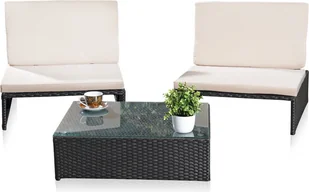 Zestaw ogrodowy wykonany jest z odpornego na warunki atmosferyczne polirattanu, dzięki czemu charakteryzuje się niską wagą. Metalowa rama zapewnia stabilność. Opis: Kolor: czarny (wiklina) i beżowy (poduszki)Wymiary fotela: ok. 68 cm x 75 cm x 72 cm (wys. x szer. x gł.)Wymiary powierzchni do leżenia (oba fotele razem):