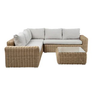 - Komplet składa się z narożnika modułowego oraz stolika kawowego z hartowanym szklanym blatem.