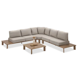 Dzięki modułowej budowie zestaw MAGELLAN CAFFE można swobodnie konfigurować, dopasowując go do przestrzeni i indywidualnych potrzeb. Składa się z dwóch sof, modułu narożnego oraz praktycznego stolika kawowego, który doskonale komponuje się z całością. Aluminiowy blat z listwami nie tylko świetnie wygląda, ale również jest odporny na warunki atmosferyczne i łatwy w utrzymaniu czystości. Dzięki ponadczasowej estetyce i neutralnym odcieniom beżowo-szarej tapicerki, narożnik doskonale wpisuje się w nowoczesne, boho i skandynawskie aranżacje ogrodów, tarasów i patio. Jego obszerne siedziska i poduszki zapewniają relaks na najwyższym poziomie, zachęcając do długich godzin spędzonych na świeżym powietrzu.