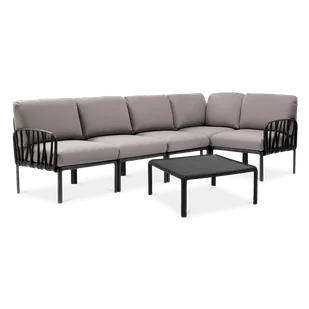 Narożnik ogrodowy Nardi KOMODO ze stolikiem Antracite Grigio - Podręcznikowy przykład na to, jak szerokie zastosowania mogą mieć meble ogrodowe najwyższej jakości - z użyciem w lokalach HoReCa włącznie. Narożnik Nardi Komodo Antracite Grigio składa się z 5 podstawowych modułów oraz kompletu poduszek (w kilku wariantach kolorystycznych do wyboru) na siedziska i oparcia. Dodatkowo cały zestaw uzupełnia niewielki stolik kawowy, w tym samym co kanapowe stelaże odcieniu grafitowym. Główne elementy składające się na narożnik Komodo od renomowanej firmy Nardi można łączyć ze sobą w różnorodne kombinacje. Od pojedynczych, małych foteli, przez dwuosobowe ławeczki, aż po jedną, dużą kanapę w kształcie litery L.