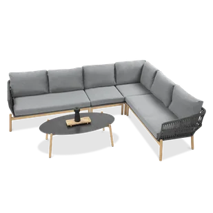 Sofa narożna - idealne miejsce na relaks pod gołym niebem. Sofa środkowa - doskonałe uzupełnienie, które pozwoli dostosować zestaw do Twoich potrzeb. Elegancka rama wykonana z aluminium wykończona farbą proszkową gwarantuje trwałość i odporność na każde warunki atmosferyczne. Nogi mebli w pięknym tekowym kolorze dodają meblom wyjątkowego charakteru. Poduszki siedziska i oparcia wykonane z wysokiej jakości poliestru oferują niezrównany komfort i są łatwe w utrzymaniu czystości.