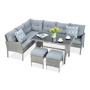 Opis: Stylowy komplet mebli, wystarczający do ugoszczenia nawet 8 osób jednocześnie. W skład zestawu wchodzą narożnik technorattanowy Cortina Dolphin Grey - czyli 2 połączone ze sobą sofy trzyosobowe - 2 pufy oraz duży stół. Ten ostatni zwieńczony jest blatem z hartowanego szkła, natomiast pozostałe elementy powstały z szarego technorattanu, oplecionego na solidnym i wytrzymałym stelażu ze stali. Dzięki temu cały zestaw mebli ogrodowych z narożnikiem Cortina wygląda wprost niesamowicie, a w użytkowaniu sprawdza się jeszcze lepiej. Wykonany z technorattanu narożnik ogrodowy Cortina Dolphin Grey cechuje wysoka odporność na czynniki pogodowe i typowe zabrudzenia, jakie mogą powstać podczas użytkowania mebli.