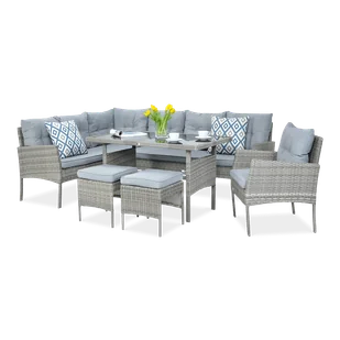 Opis: CORTINA to niezwykle funkcjonalny i ekonomiczny narożnik ogrodowy składający się z 2 sof narożnych, 2 puf, fotela oraz praktycznego stołu ze szklanym blatem. Wysoki stół sprawia, że narożnik doskonale łączy w sobie funkcję jadalnianą i wypoczynkową. Stalowa konstrukcja malowana proszkowo wykończona jest wysokiej jakości technorattanem. O dodatkowy komfort dbają wygodnie poduszki na siedzisku i oparciu. Całość jest bardzo łatwa do utrzymania w czystości.