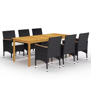 Stół jadalniany wykonano z litego drewna akacjowego, wykończonego olejem, dzięki czemu jest stabilny, trwały i łatwy w utrzymaniu. Zawierające malowane proszkowo, stalowe ramy pokryte odpornym na czynniki pogodowe rattanem PE krzesła stołowe są mocne i łatwe do czyszczenia. Krzesło ogrodowe z wygiętym oparciem i podłokietnikami ma ekonomiczny kształt zapewniający maksimum komfortu. Podłokietniki są pięknie ozdobione litym drewnem akacjowym, co nadaje meblom rustykalny urok. Ponadto grubo wyściełane poduszki zapewniają najwyższy komfort siedzenia.