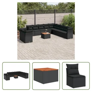 12-częściowy zestaw sof ogrodowych z poduszkami z czarnego polirattanuTen zestaw sof ogrodowych jest idealnym dodatkiem do ogrodu, patio lub dziedzińca. Zapewnia wygodne i zachęcające miejsce do rozmów z rodziną i przyjaciółmi lub po prostu relaksu i cieszenia się życiem na świeżym powietrzu. Wytrzymały materiał: rattan PE, znany również jako polirattan, to wytrzymały, łatwy w pielęgnacji materiał syntetyczny o wyglądzie naturalnego rattanu. Charakteryzuje się niską wagą i jest łatwy w czyszczeniu.