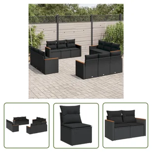 12-częściowy zestaw sof ogrodowych z poduszkami z czarnego polirattanuTen zestaw sof ogrodowych jest idealnym dodatkiem do ogrodu, patio lub dziedzińca. Zapewnia wygodne i zachęcające miejsce do rozmów z rodziną i przyjaciółmi lub po prostu relaksu i cieszenia się życiem na świeżym powietrzu. Wytrzymały materiał: rattan PE, znany również jako polirattan, to wytrzymały, łatwy w pielęgnacji materiał syntetyczny o wyglądzie naturalnego rattanu. Charakteryzuje się niską wagą i jest łatwy w czyszczeniu.