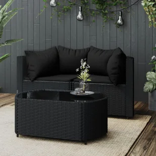 czarnyMateriał: rattan PE, stal malowana proszkowo, tkanina (100% poliester), szkło hartowaneMateriał wypełnienia: pianka, włókno bawełnianeSofa narożna: Wymiary (za sztukę): 63 x 63 x 57,5 cm (szer. x gł. x wys.)Rozmiar siedziska: