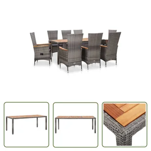 Ten stylowy zestaw jadalniany z polirattanu będzie przyciągał wzrok w ogrodzie lub na tarasie! Ten rattanowy zestaw jadalniany zachwyca eleganckim, nowoczesnym designem i jest idealny do spożywania posiłków na świeżym powietrzu lub po prostu relaksu w ogrodzie. Wykonany z odpornego na warunki pogodowe i wodę rattanu PE, zestaw jadalniany jest łatwy do czyszczenia, wytrzymały i nadaje się do codziennego użytku. Malowane proszkowo stalowe ramy zapewniają stabilność i wytrzymałość stołu i krzeseł. Blat stołu i podłokietniki wykonane są z drewna akacjowego, tropikalnego drewna liściastego, które nadaje rustykalny urok. Dwa z ośmiu krzeseł mają regulowane oparcia.