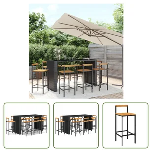 CzarnyMateriał: rattan PE, stal malowana proszkowo, szkło hartowaneWymiary: 185 x 80 x 110 cm (dł. x szer. x wys.)Grubość szkła: 4 mmDostawa obejmuje: 1 x stół barowy8 x krzesło barowe