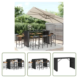 CzarnyMateriał: rattan PE, stal malowana proszkowo, szkło hartowaneWymiary: 185 x 80 x 110 cm (dł. x szer. x wys.)Grubość szkła: 4 mmDostawa obejmuje: 1 x stół barowy8 x stołki barowe