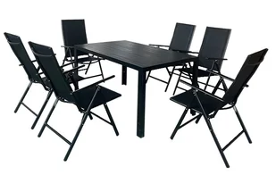 Zestaw obiadowy VERA dla 6 osób – elegancki czarny stół i wygodne krzesła z poduszkami. Nowoczesny design, solidna stalowa konstrukcja i odporność na warunki atmosferyczne. Idealny do ogrodu, na taras lub patio.