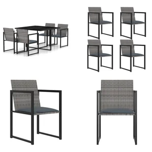 5-częściowy ogrodowy zestaw jadalniany z poduszkami z szarego polirattanuTen modny ogrodowy zestaw jadalniany to doskonały wybór do spożywania posiłków na świeżym powietrzu, zarówno na patio, jak i w ogrodzie. Malowane proszkowo stalowe ramy sprawiają, że stół i krzesła są stabilne i wytrzymałe. Blat stołu z hartowanego szkła można łatwo wyczyścić wilgotną ściereczką. Dzięki lekkiej konstrukcji z rattanu PE krzesła można łatwo przenosić. Ponadto poduszki zapewniają dodatkowy komfort podczas posiłku.